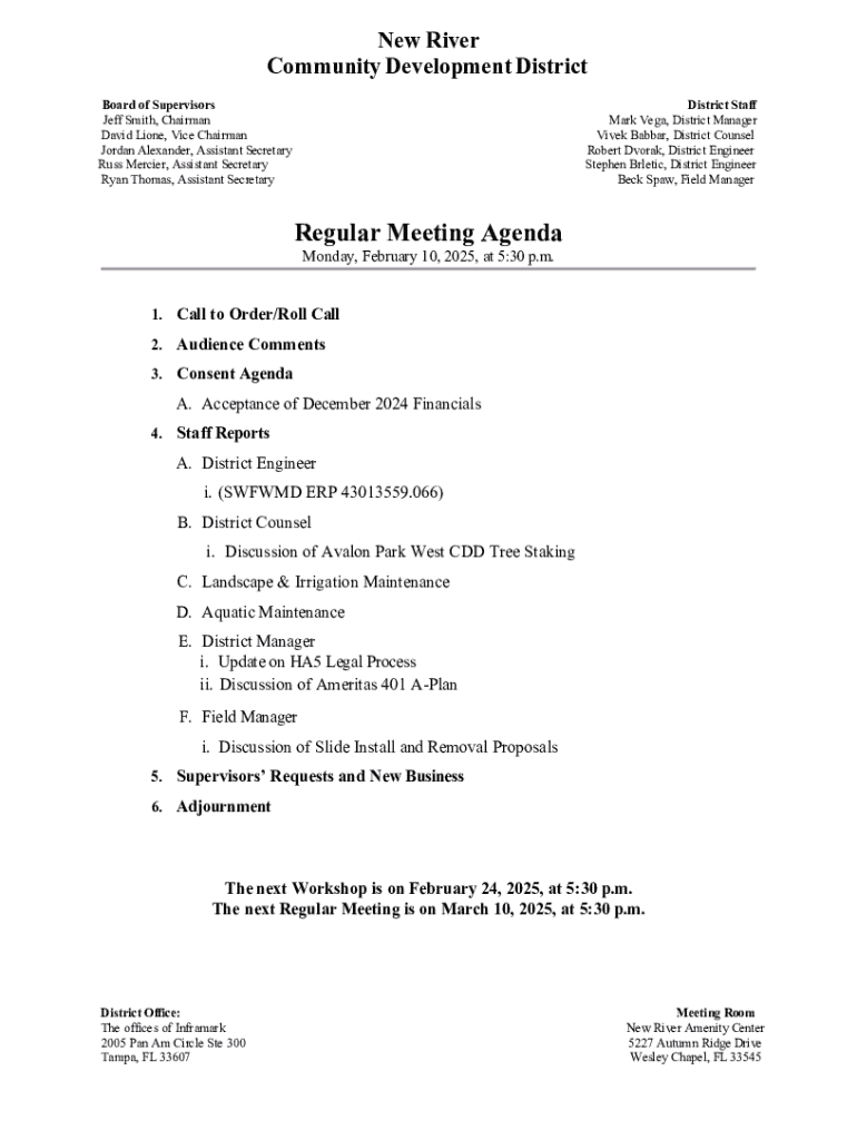 This document contains the agenda for the Regular Meeting of the New River Community Development District, scheduled for February 10, 2025, at 5:30 PM. It includes items such as roll call, audience