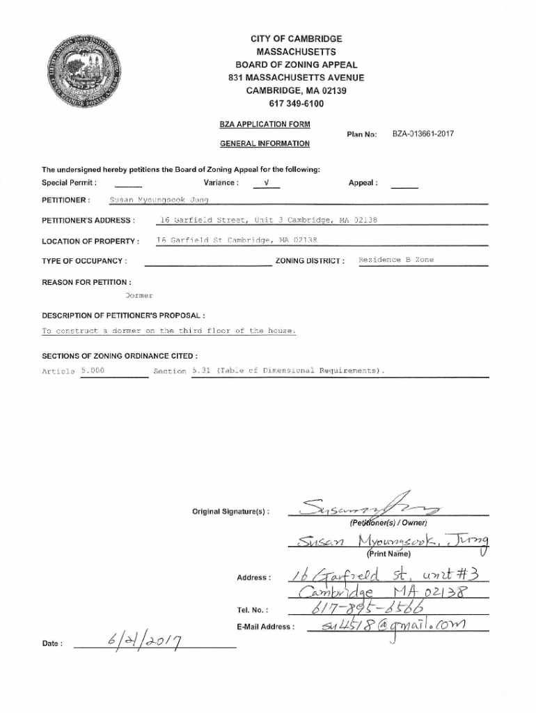 Este formulario es utilizado para solicitar una variación o permiso especial ante la Junta de Apelación de Zoning en Cambridge, Massachusetts. El solicitante debe proporcionar información general,