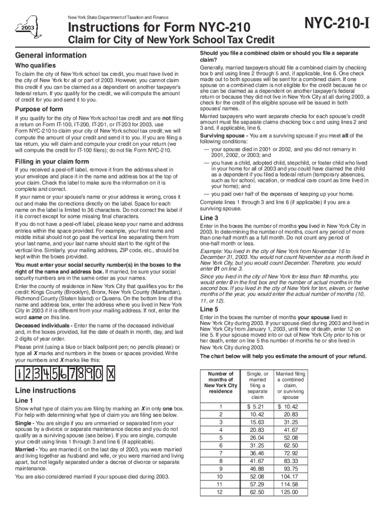 Instructions for claiming the City of New York School Tax Credit for residents who lived in New York City during 2003 and meet specific eligibility criteria.