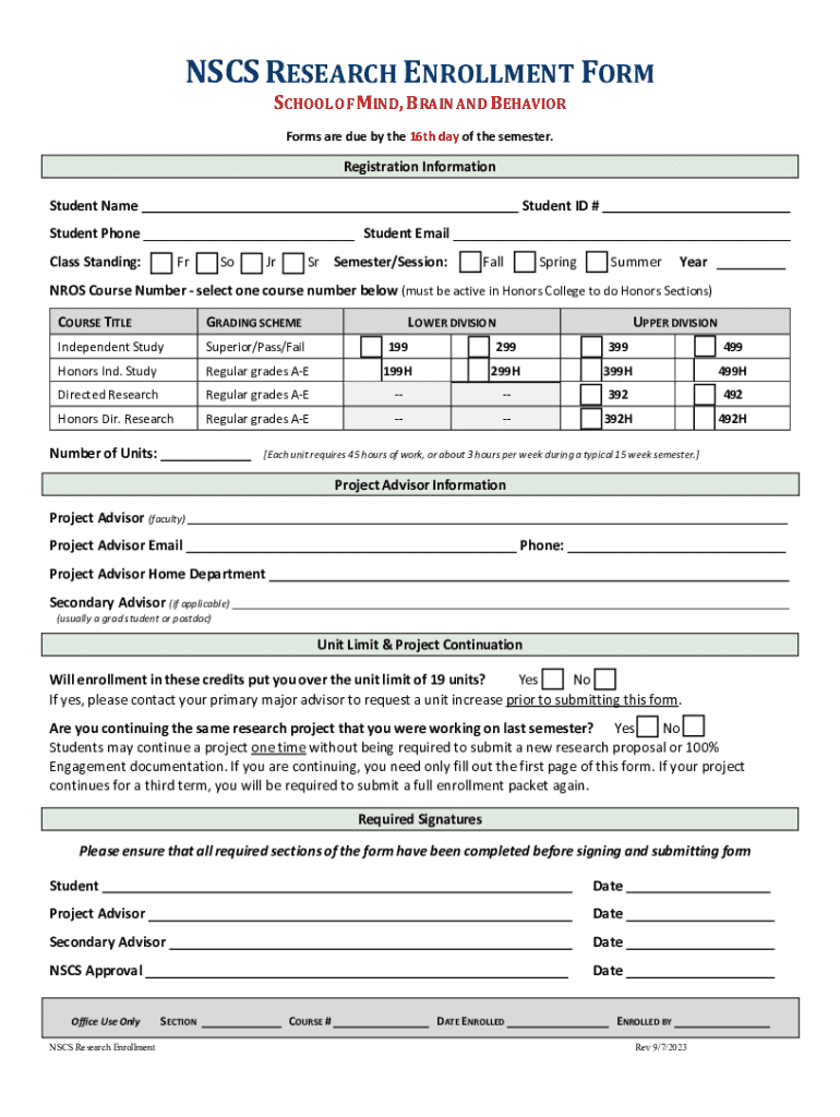 The NSCS Research Enrollment Form is a document used to register participants in research studies conducted by the National Society of Collegiate Scholars, helping to track and manage research activities.