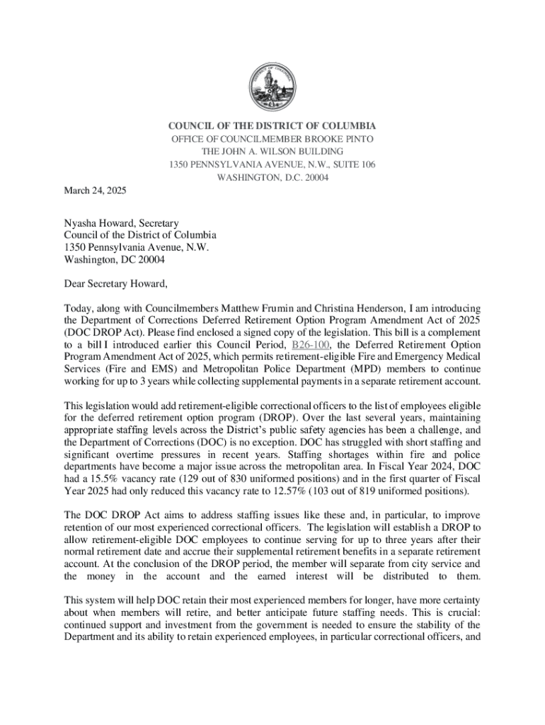 COUNCIL OF THE DISTRICT OF COLUMBIA OFFICE OF COUNCILMEMBER BROOKE PINTO THE JOHN A. WILSON BUILDING 1350 PENNSYLVANIA AVENUE, N.W., SUITE 106 WASHINGTON, D.C. 20004 March 24, 2025Nyasha Howard, Secretary
