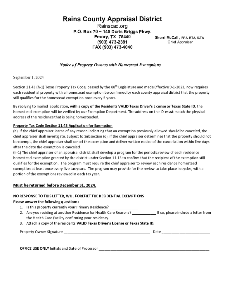 This document serves as a notice to property owners regarding the confirmation of their homestead exemptions as required by the Texas Property Tax Code. It outlines the process for verifying the homestead