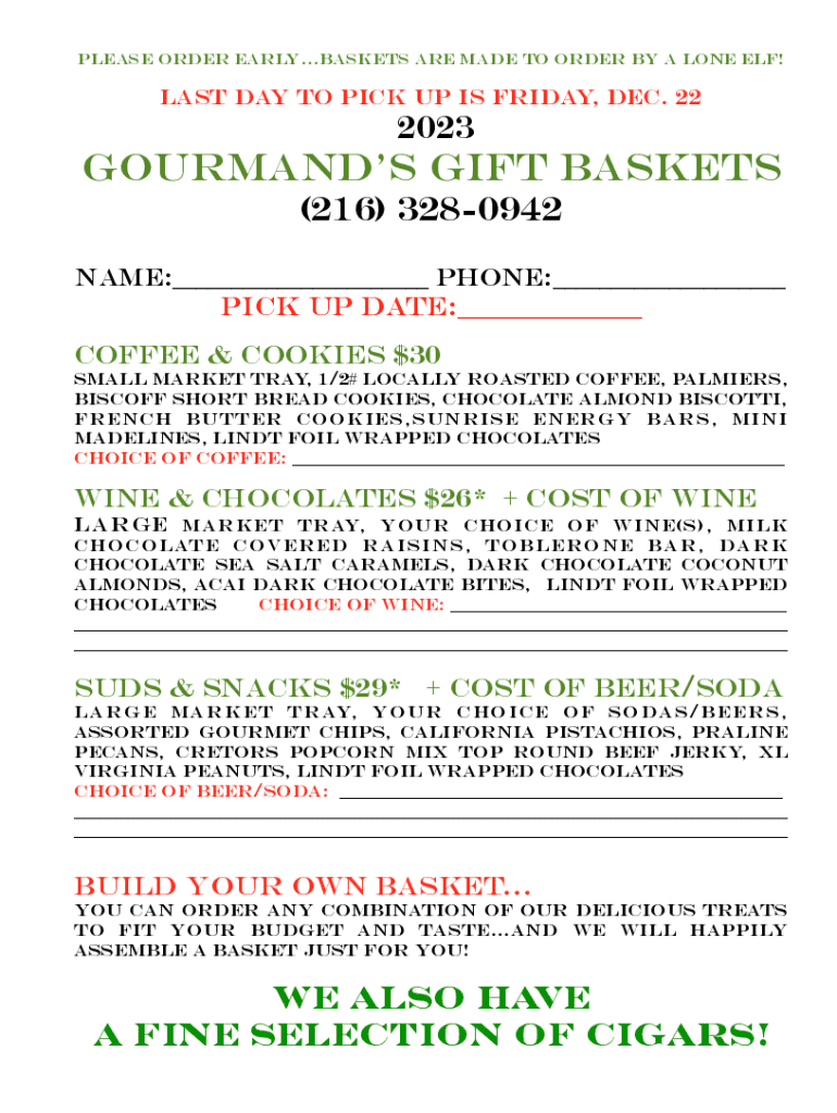 please order earlybaskets are made to order by a lone elf!last day to pick up is friday, dec. 222023gourmands gift baskets (216) 3280942 name:___ Phone:___Pick up date:___ coffee & cookies $30small