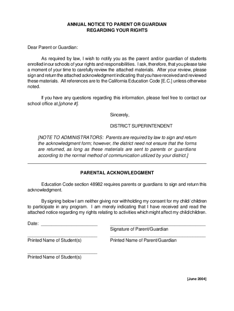 Este documento notifica a los padres o tutores sobre sus derechos y responsabilidades relacionados con la educación de sus hijos, de acuerdo con el Código de Educación de California. Se solicita