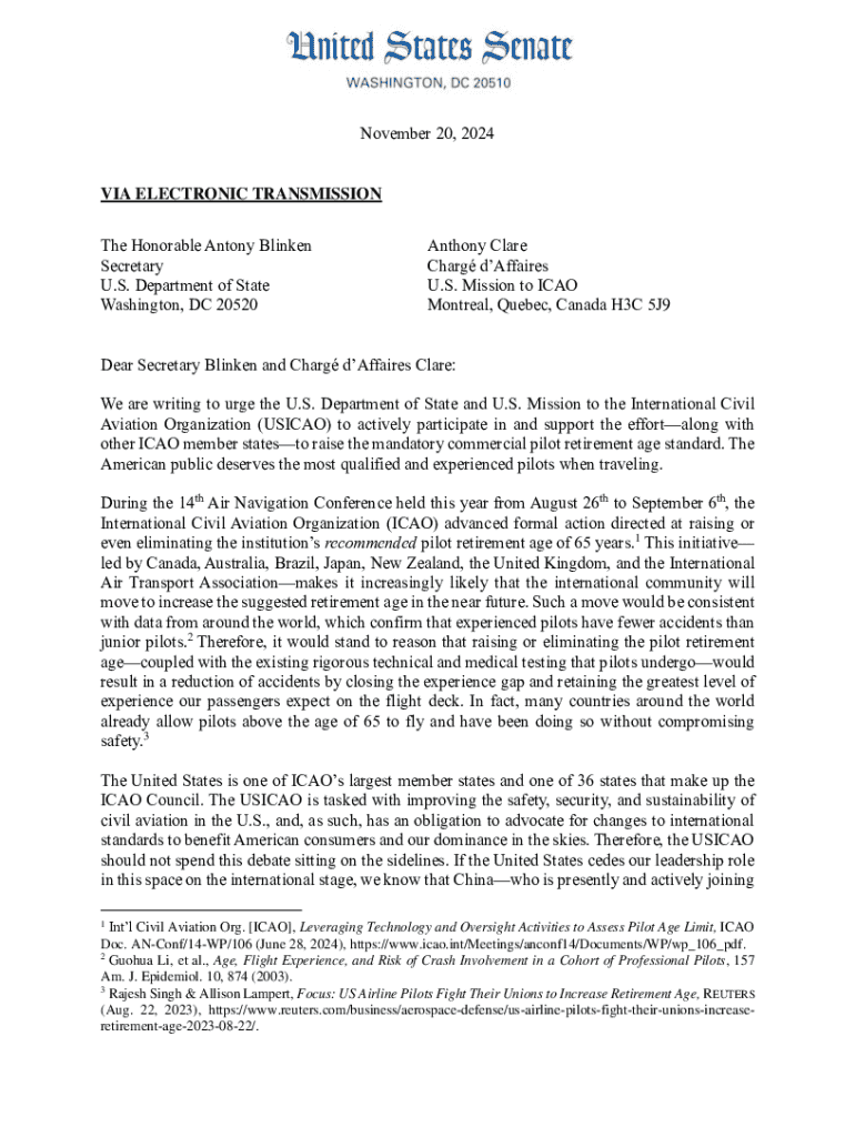 November 20, 2024VIA ELECTRONIC TRANSMISSION The Honorable Antony Blinken Secretary U.S. Department of State Washington, DC 20520Anthony Clare Charg dAffaires U.S. Mission to ICAO Montreal, Quebec,