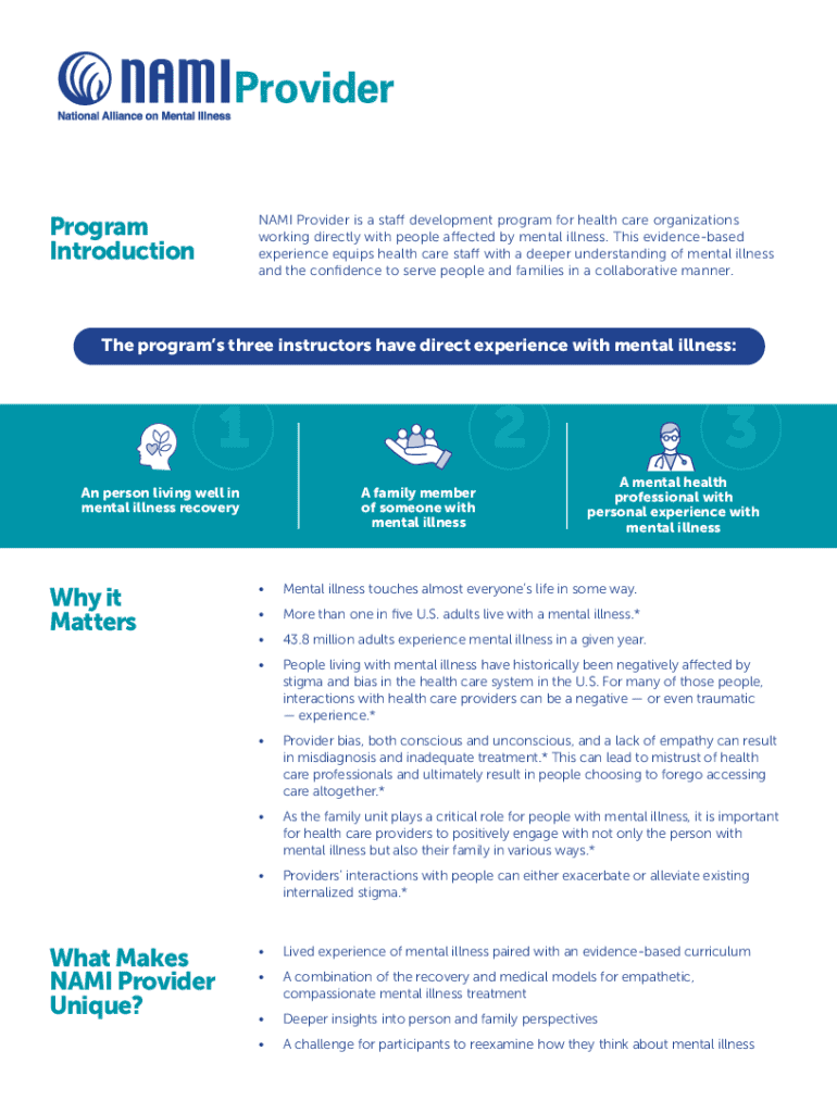 The NAMI Provider program is designed for health care organizations working directly with individuals affected by mental illness, providing staff development through an evidence-based curriculum that