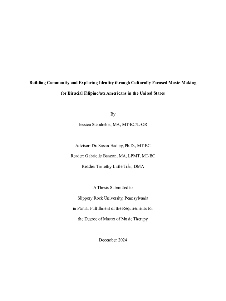 Building Community and Exploring Identity through Culturally Focused MusicMaking for Biracial Filipino/a/x Americans in the United StatesBy Jessica Steinhebel, MA, MTBC/LORAdvisor: Dr. Susan Hadley,