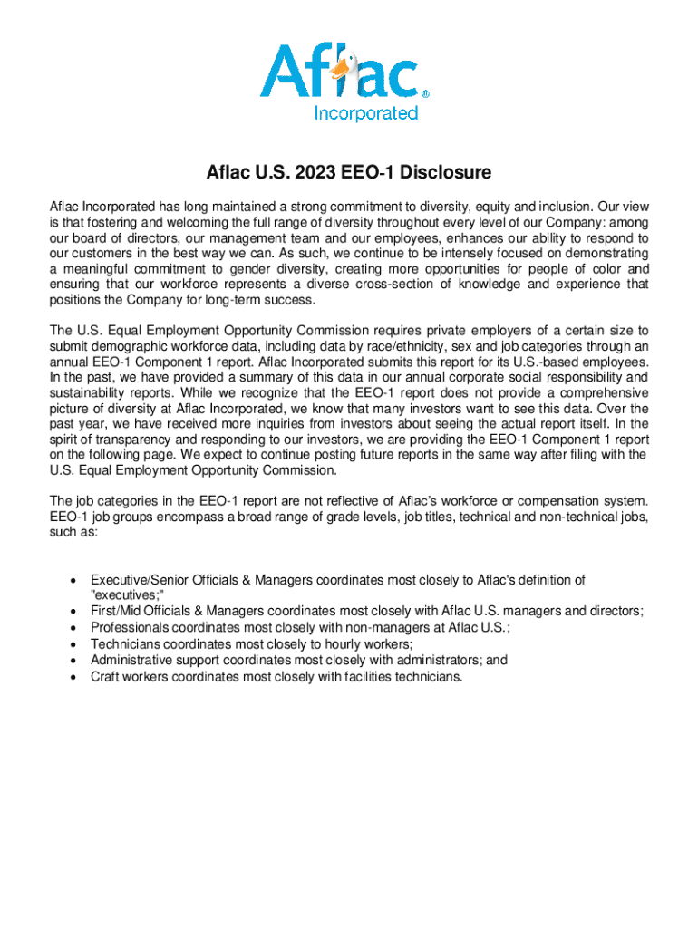 Aflac US 2023 EEO-1 is a compliance survey mandated by the Equal Employment Opportunity Commission (EEOC), which requires employers to provide a demographic breakdown of their workforce by race, sex, and job category.