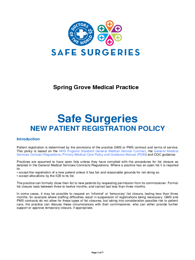 This policy outlines the procedures and guidelines for registering new patients in the Spring Grove Medical Practice, including criteria for acceptance and refusal based on various factors, as well