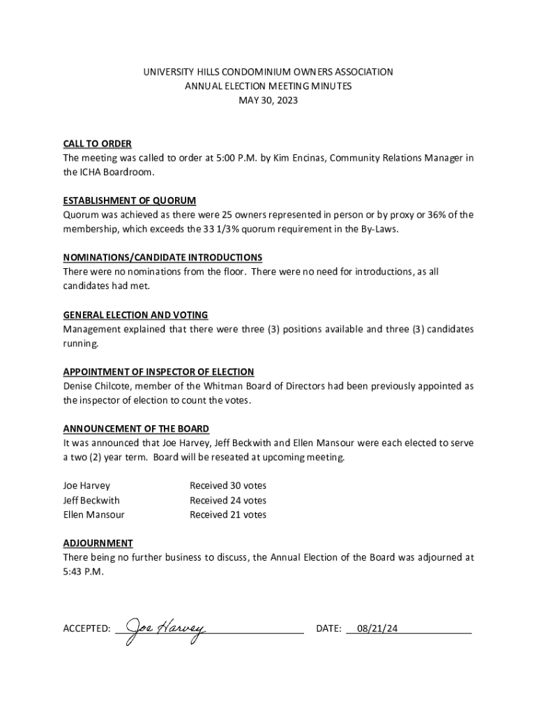 Get the free University Hills Condominium Owners Association Annual Election Meeting Minutes - ic...