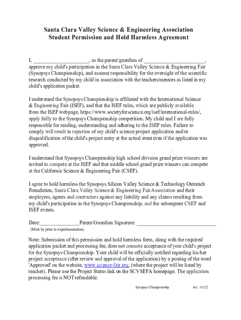 This document serves as a permission slip and hold harmless agreement for parents/guardians allowing their child to participate in the Santa Clara Valley Science & Engineering Fair (Synopsys Championship)
