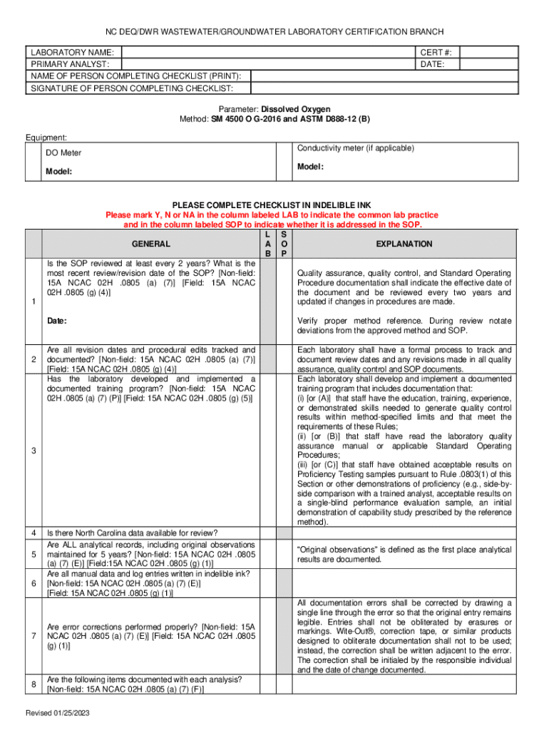 NC DEQ/DWR WASTEWATER/GROUNDWATER LABORATORY CERTIFICATION BRANCH LABORATORY NAME: PRIMARY ANALYST: NAME OF PERSON COMPLETING CHECKLIST (PRINT): SIGNATURE OF PERSON COMPLETING CHECKLIST:CERT #: DATE:Parameter: