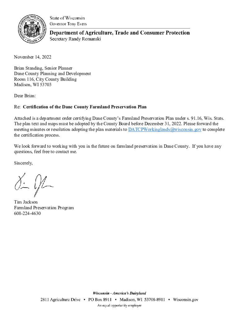 November 14, 2022 Brian Standing, Senior Planner Dane County Planning and Development Room 116, City County Building Madison, WI 53703 Dear Brian: Re: Certification of the Dane County Farmland Preservation