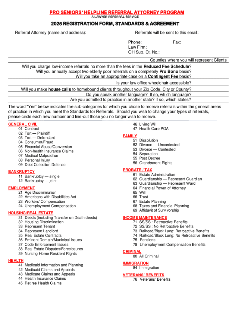 A registration form for attorneys to participate in the Pro Seniors’ Helpline Referral Attorney Program, outlining standards for referrals, agreements for accepting clients, and various legal areas