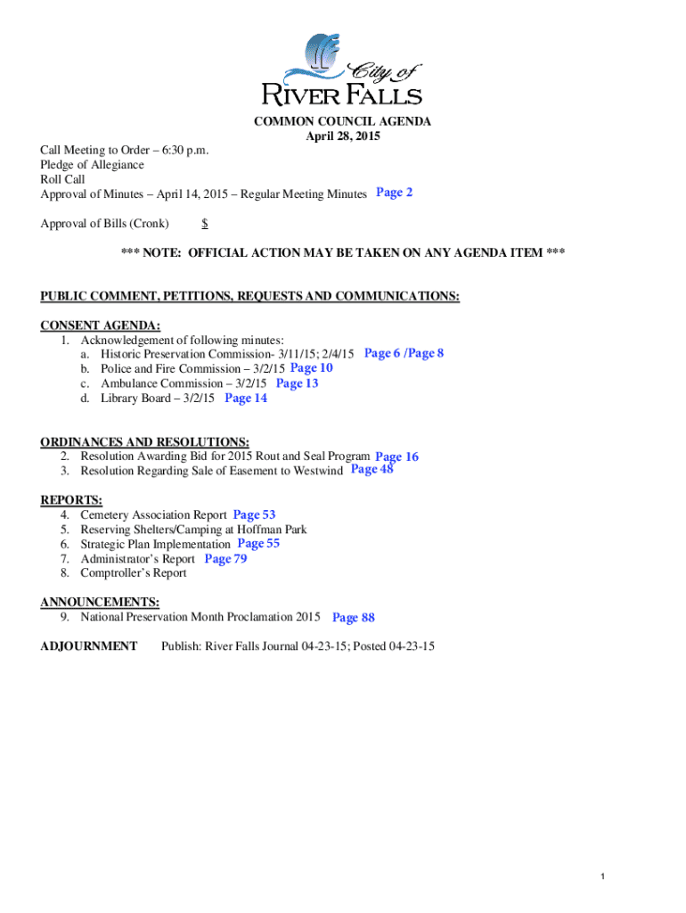 This document outlines the agenda and minutes of the Common Council meeting held in River Falls, Wisconsin, on April 28, 2015. It includes key topics such as public comments, consent agenda items,