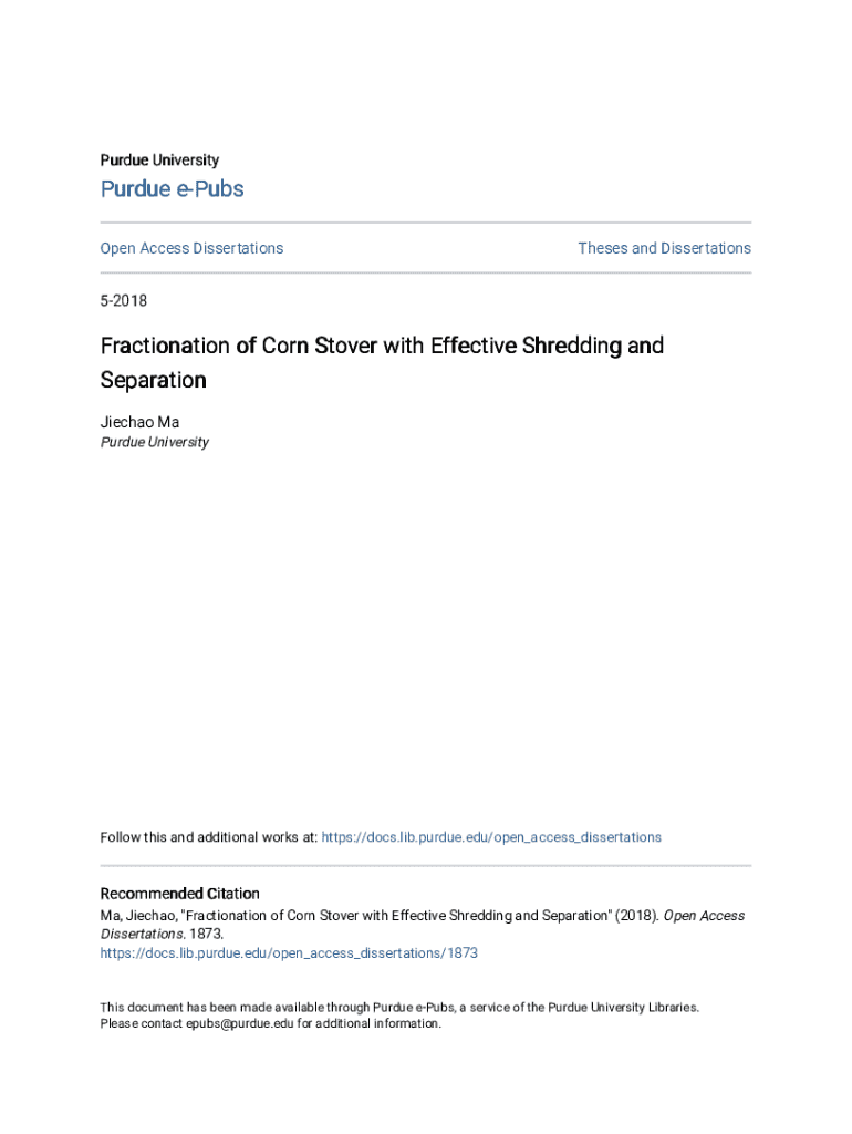 Purdue UniversityPurdue ePubs Open Access DissertationsTheses and Dissertations52018Fractionation of Corn Stover with Effective Shredding and Separation Jiechao Ma Purdue UniversityFollow this and