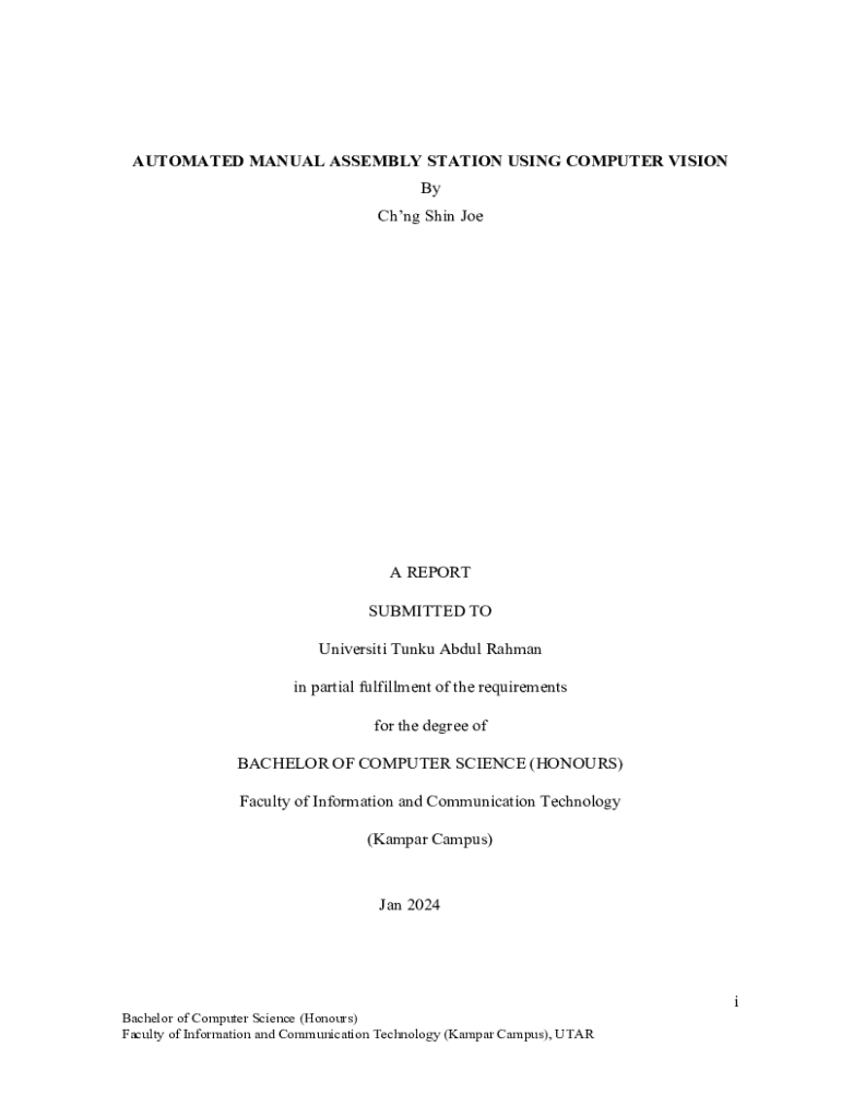 AUTOMATED MANUAL ASSEMBLY STATION USING COMPUTER VISION By Chng Shin JoeA REPORT SUBMITTED TO Universiti Tunku Abdul Rahman in partial fulfillment of the requirements for the degree of BACHELOR OF