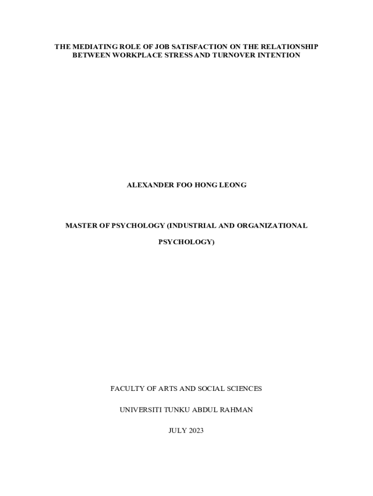 This dissertation explores the mediating effects of job satisfaction on the relationship between workplace stress and turnover intention among academic staff in private higher education institutions