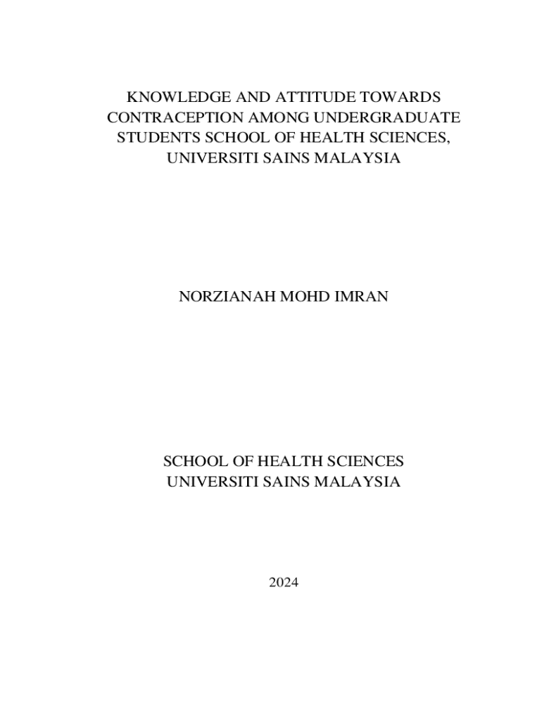 This dissertation assesses the levels of knowledge and attitudes towards contraception among undergraduate students at the School of Health Sciences, Universiti Sains Malaysia. It investigates the