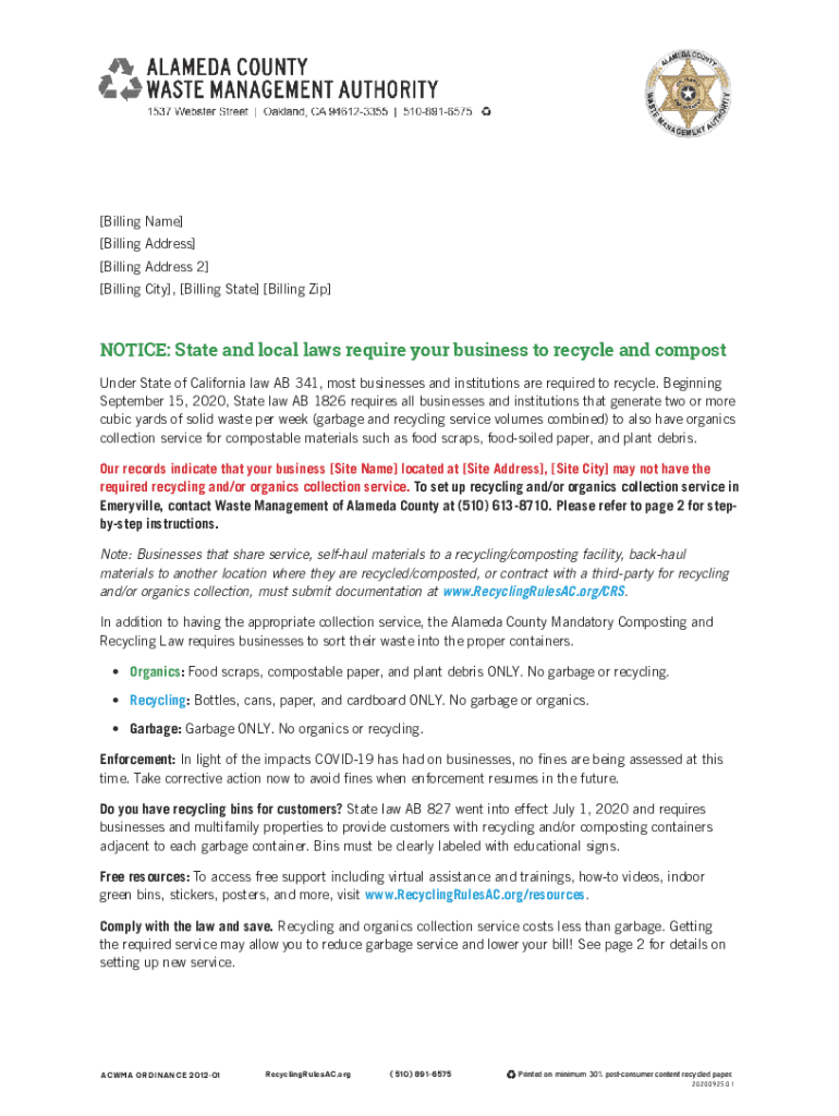 Get the free NOTICE: State and local laws require your business to recycle and compost