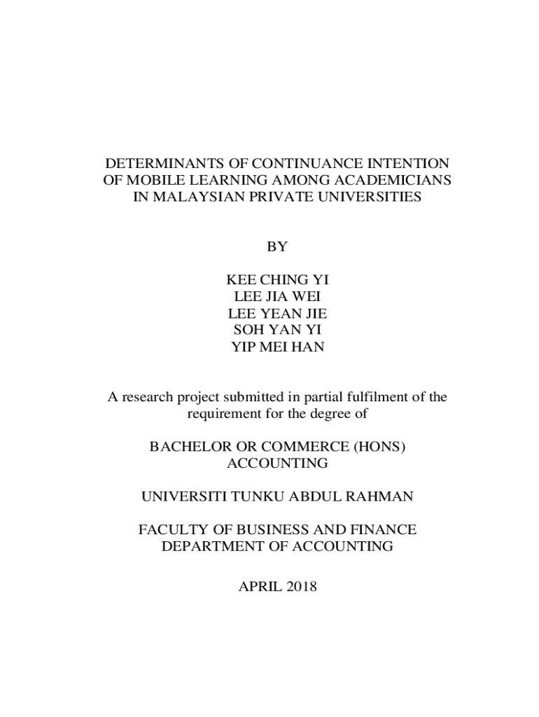 DETERMINANTS OF CONTINUANCE INTENTION OF MOBILE LEARNING AMONG ACADEMICIANS IN MALAYSIAN PRIVATE UNIVERSITIESBY KEE CHING YI LEE JIA WEI LEE YEAN JIE SOH YAN YI YIP MEI HANA research project submitted