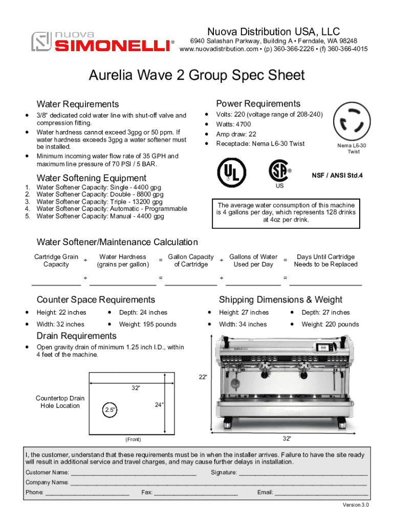 This specification sheet outlines the power and water requirements, water softening equipment details, maintenance calculations, counter space requirements, shipping dimensions, and drain requirements
