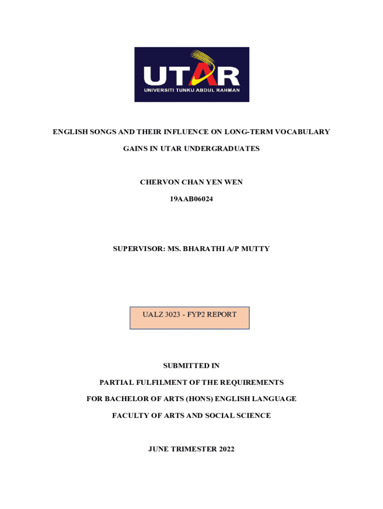 ENGLISH SONGS AND THEIR INFLUENCE ON LONGTERM VOCABULARY GAINS IN UTAR UNDERGRADUATESCHERVON CHAN YEN WEN 19AAB06024SUPERVISOR: MS. BHARATHI A/P MUTTYUALZ 3023 FYP2 REPORTSUBMITTED IN PARTIAL FULFILMENT