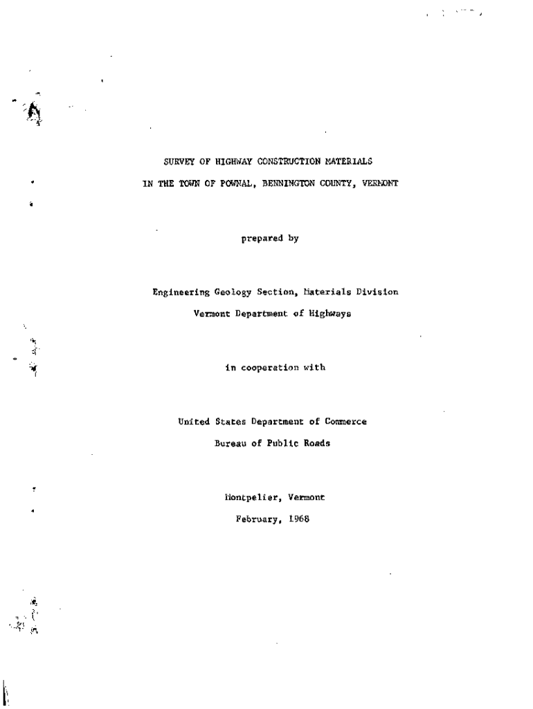 This document provides a comprehensive survey of the roadway construction materials in the town of Pownal, Vermont. Prepared by the Engineering Geology Section of the Materials Division, Vermont Department