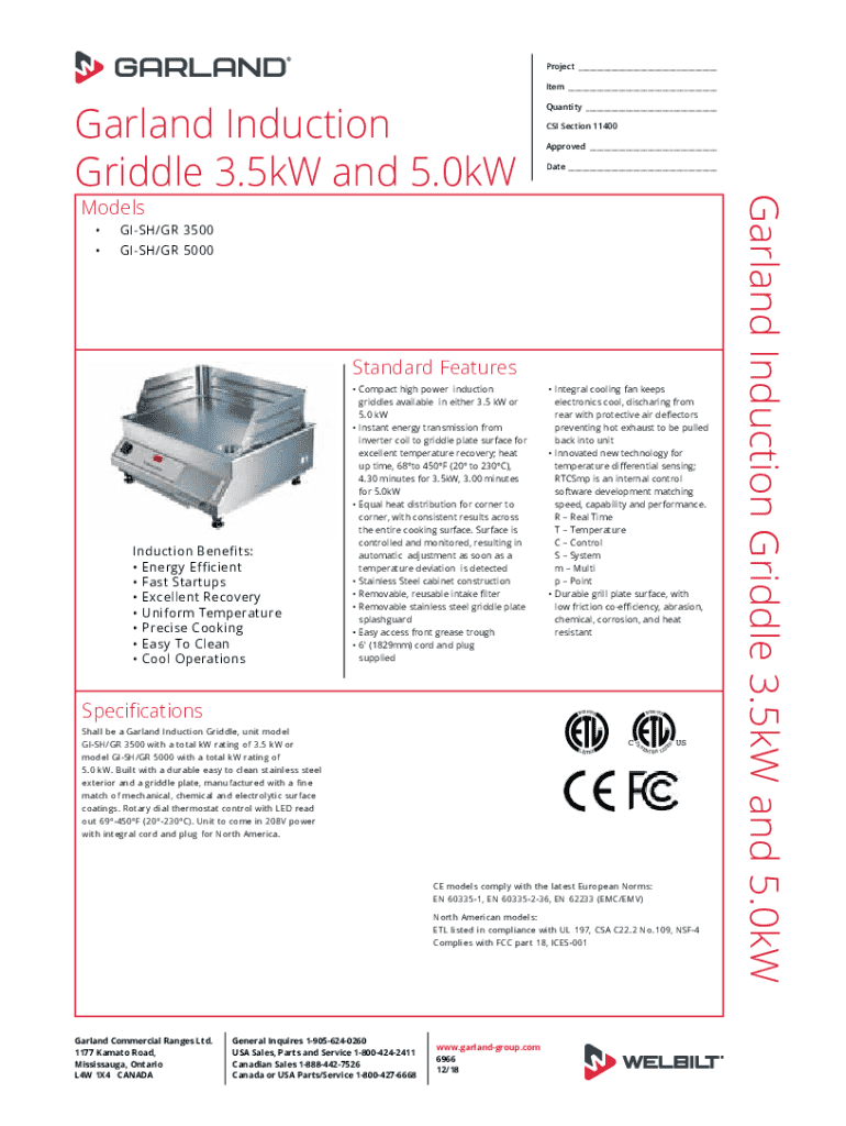 This document provides specifications, features, and model information for the Garland Induction Griddle available in 3.5 kW and 5.0 kW configurations, designed for commercial use. It highlights the