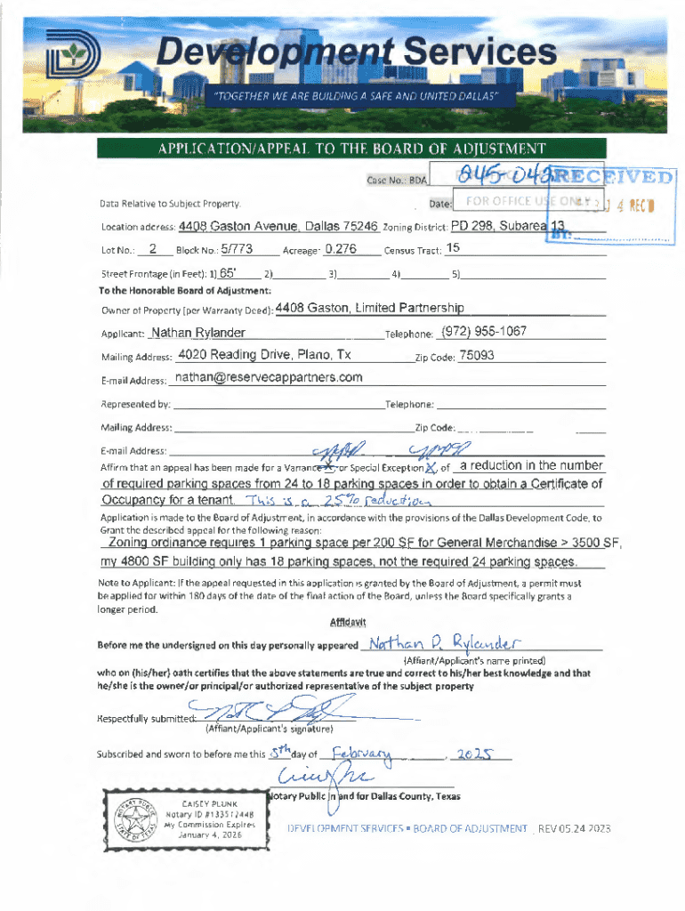 This document is an application to the Board of Adjustment for a variance regarding parking space requirements for the property located at 4408 Gaston Avenue, Dallas. The appeal requests a reduction