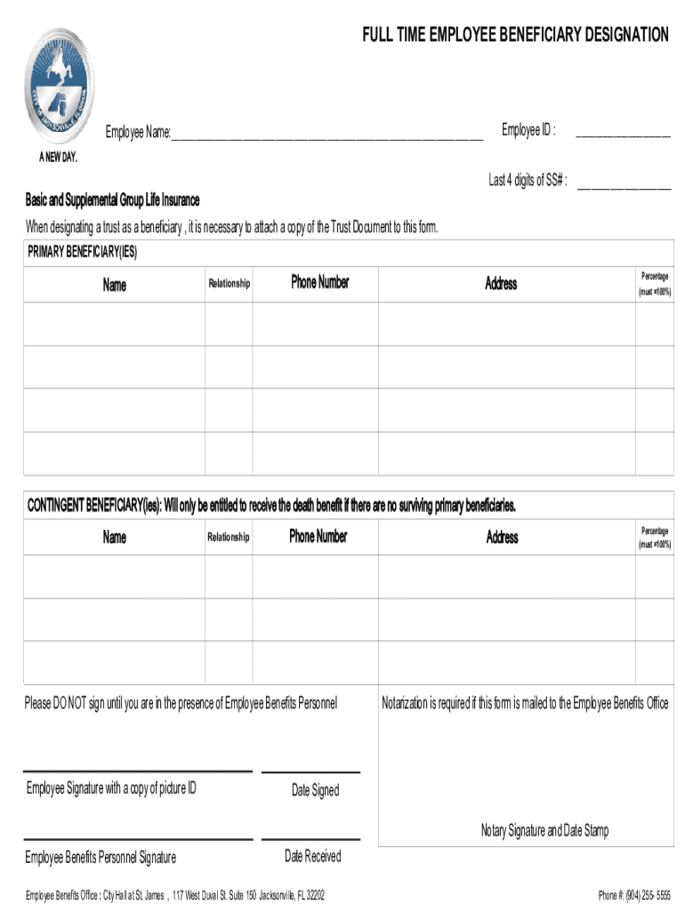 To fill out a full-time employee beneficiary form, provide the employee's personal information, details of the beneficiaries (including their names and relationship to the employee), and sign the form to certify the information is accurate.