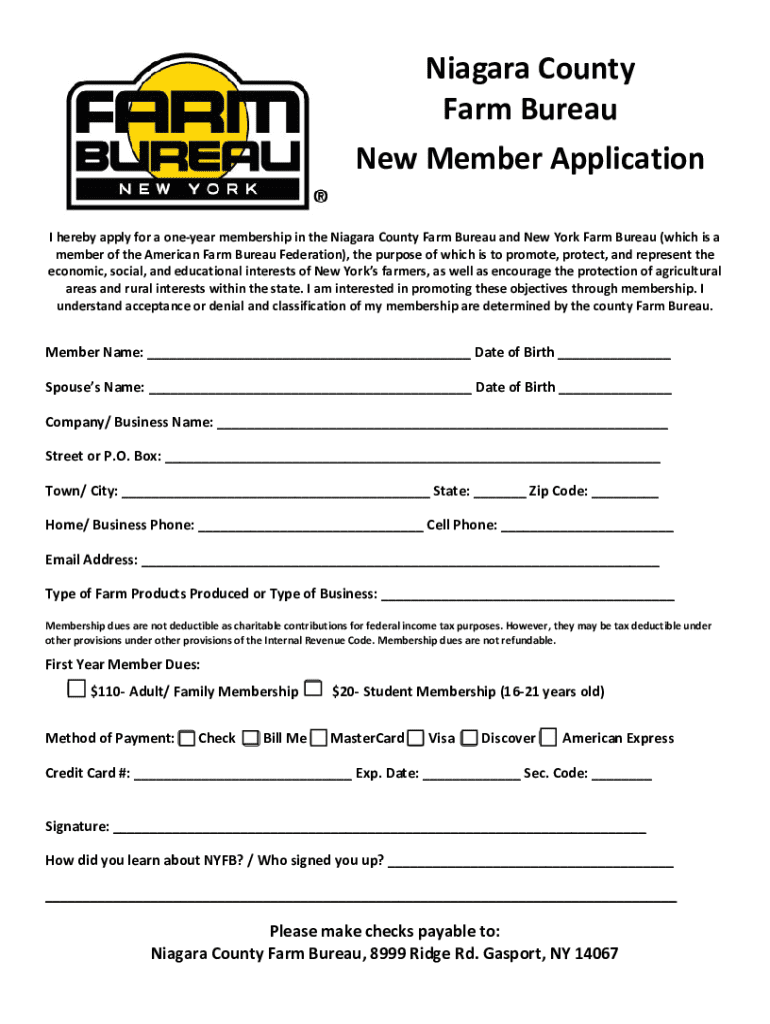 Application form for a one-year membership in the Niagara County Farm Bureau and New York Farm Bureau, promoting the interests of farmers and rural communities.