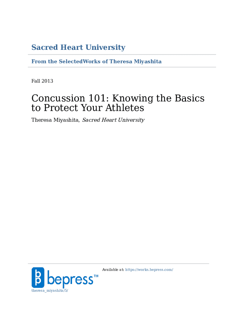 Sacred Heart University From the SelectedWorks of Theresa MiyashitaFall 2013Concussion 101: Knowing the Basics to Protect Your Athletes Theresa Miyashita, Sacred Heart UniversityAvailable at: https://works.bepress.com/theresa_miyashita/5/Journal