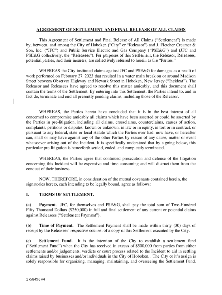 This document outlines the settlement agreement between the City of Hoboken and J. Fletcher Creamer & Son, Inc. and Public Service Electric and Gas Company regarding claims arising from a water main