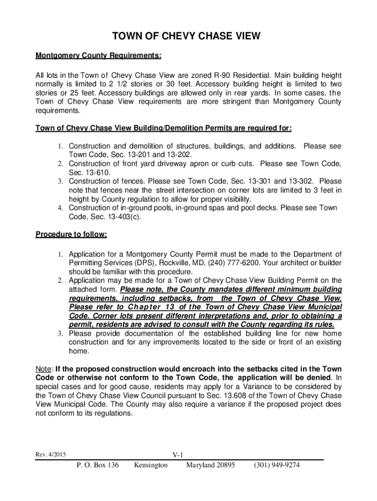 This document outlines the requirements and procedures for obtaining a building permit and variance in the Town of Chevy Chase View, including zoning information, permit applications, and documentation