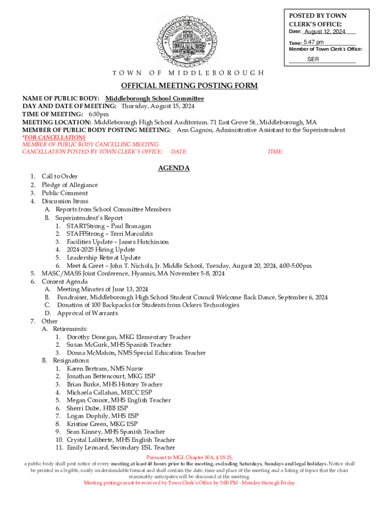 This document serves as the official posting for the upcoming meeting of the Middleborough School Committee, detailing the meeting\'s agenda, location, and important updates regarding the school district.