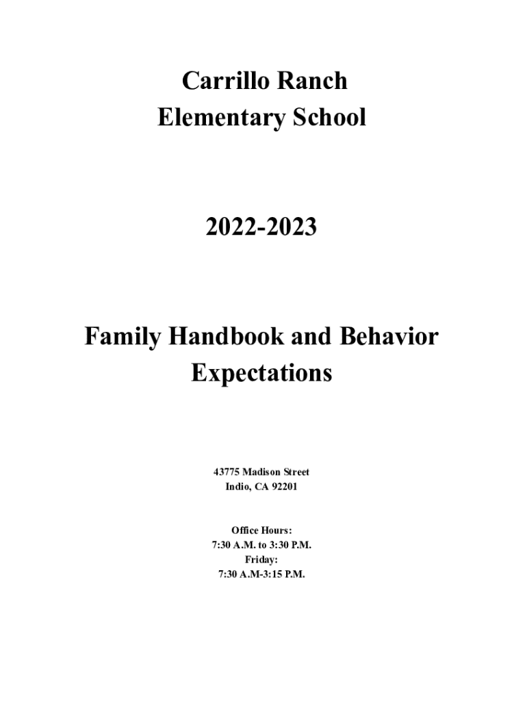 This handbook is a resource for families at Carrillo Ranch Elementary School, outlining important information regarding school procedures, behavior expectations, dress code, attendance policies, and