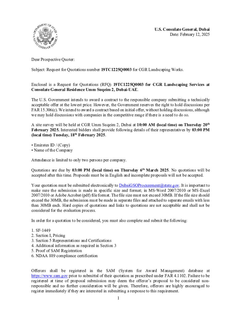This document is a Request for Quotations (RFQ) for landscaping services at the U.S. Consulate General Residence in Umm Suqeim 2, Dubai. It outlines the requirements, submission guidelines, deadlines,