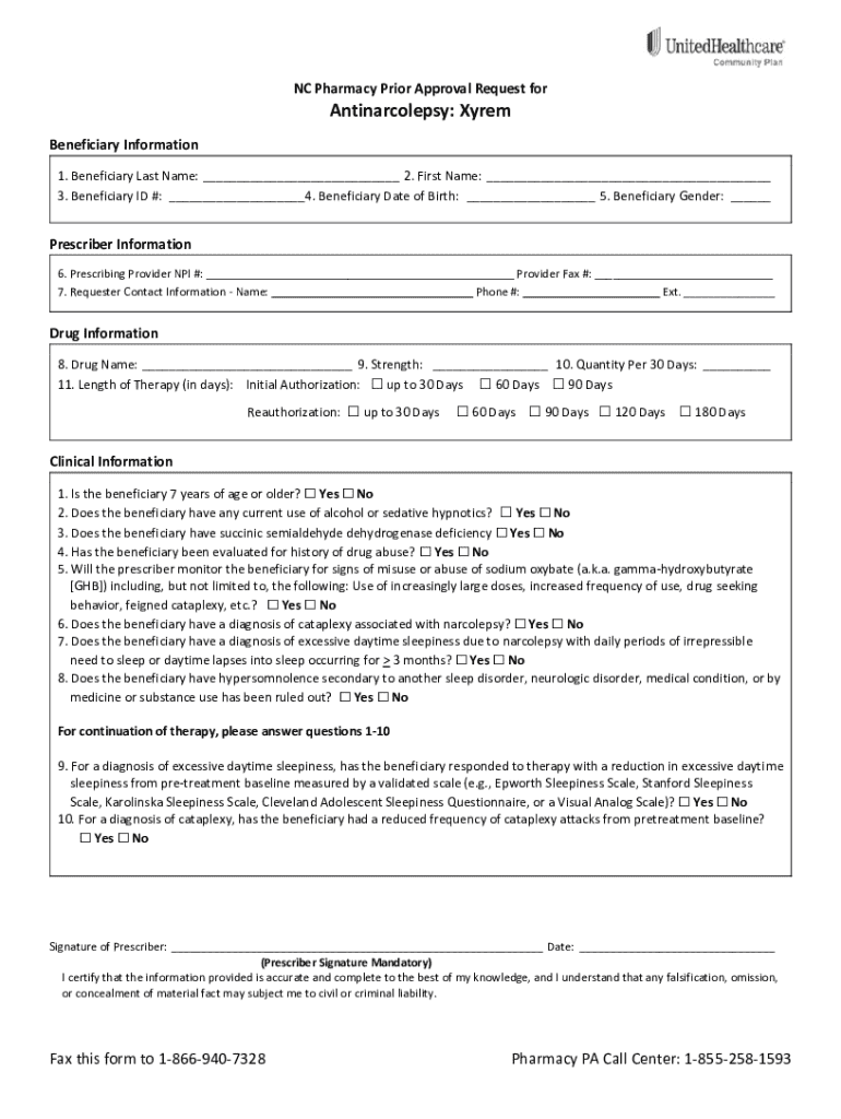 This document is a request form for prior approval of , specifically designed for beneficiaries suffering from narcolepsy and includes sections for beneficiary information, prescriber details, drug