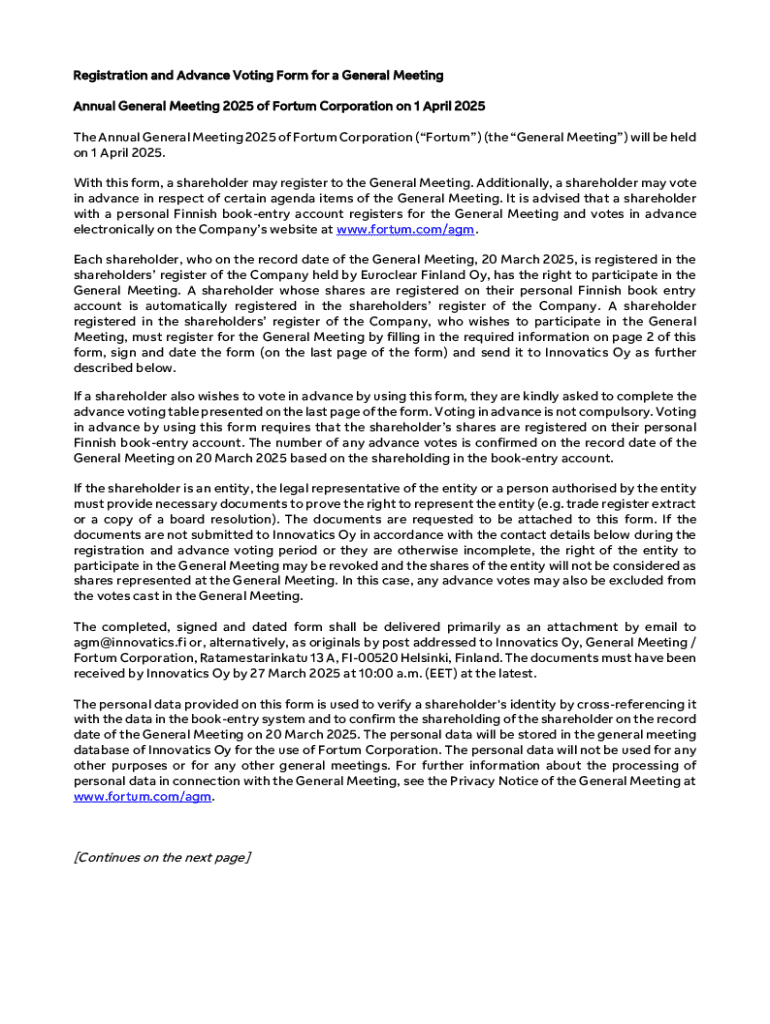 This form allows shareholders of Fortum Corporation to register for the Annual General Meeting and vote in advance on agenda items. Shareholders must fill out required personal and account information