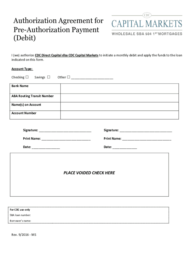 This document serves as an authorization for CDC Direct Capital to initiate monthly debits from a specified bank account for loan payments.