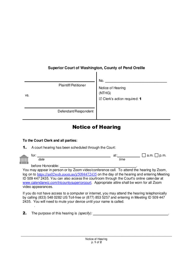 Este documento notifica a las partes y al secretario del tribunal sobre una audiencia programada en la Corte Superior del Estado de Washington, Condado de Pend Oreille, con instrucciones sobre cómo