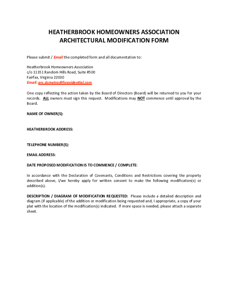This form is to be used by homeowners of the Heatherbrook community to request approval for architectural modifications or additions to their property. It outlines the necessary documentation, the