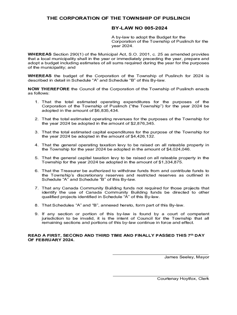 A by-law enacted by the Council of the Township of Puslinch to adopt the budget for the year 2024, including estimated operating expenditures and revenues, as well as details on capital expenditures