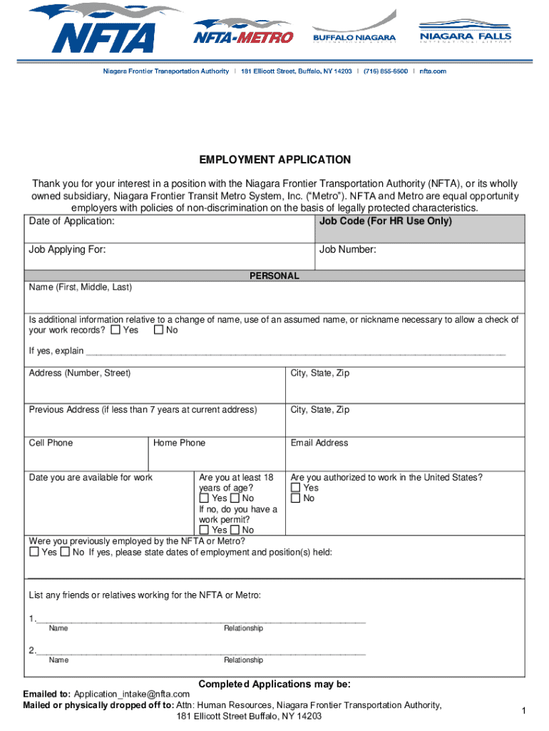 This is an employment application for positions at the Niagara Frontier Transportation Authority (NFTA) and its subsidiary, Niagara Frontier Transit Metro System, Inc. The form collects personal information,