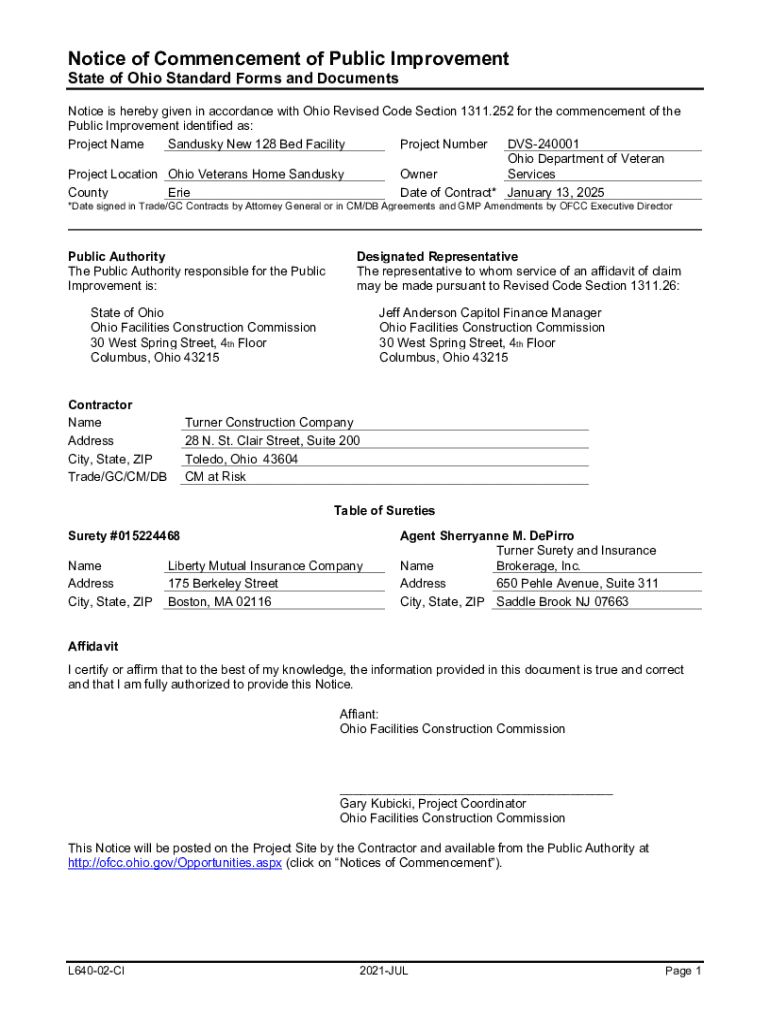 Notice is hereby given in accordance with Ohio Revised Code Section 1311.252 for the commencement of the Public Improvement identified as the Sandusky New 128 Bed Facility, Project Number DVS-240001.