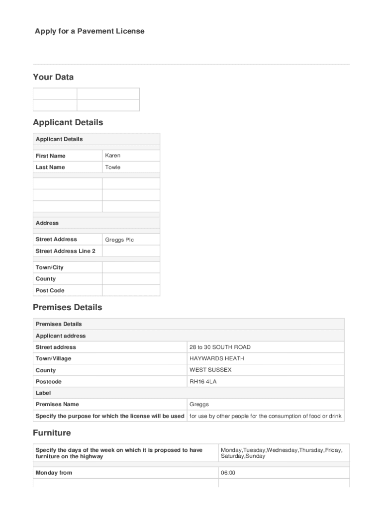 This document is an application for a Pavement License to allow the use of a specified area of the highway for the placement of furniture for the consumption of food or drink.
