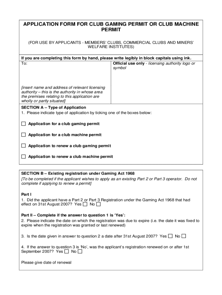This application form is intended for members’ clubs, commercial clubs, and miners’ welfare institutes seeking to apply for or renew a club gaming permit or club machine permit as per the Gaming