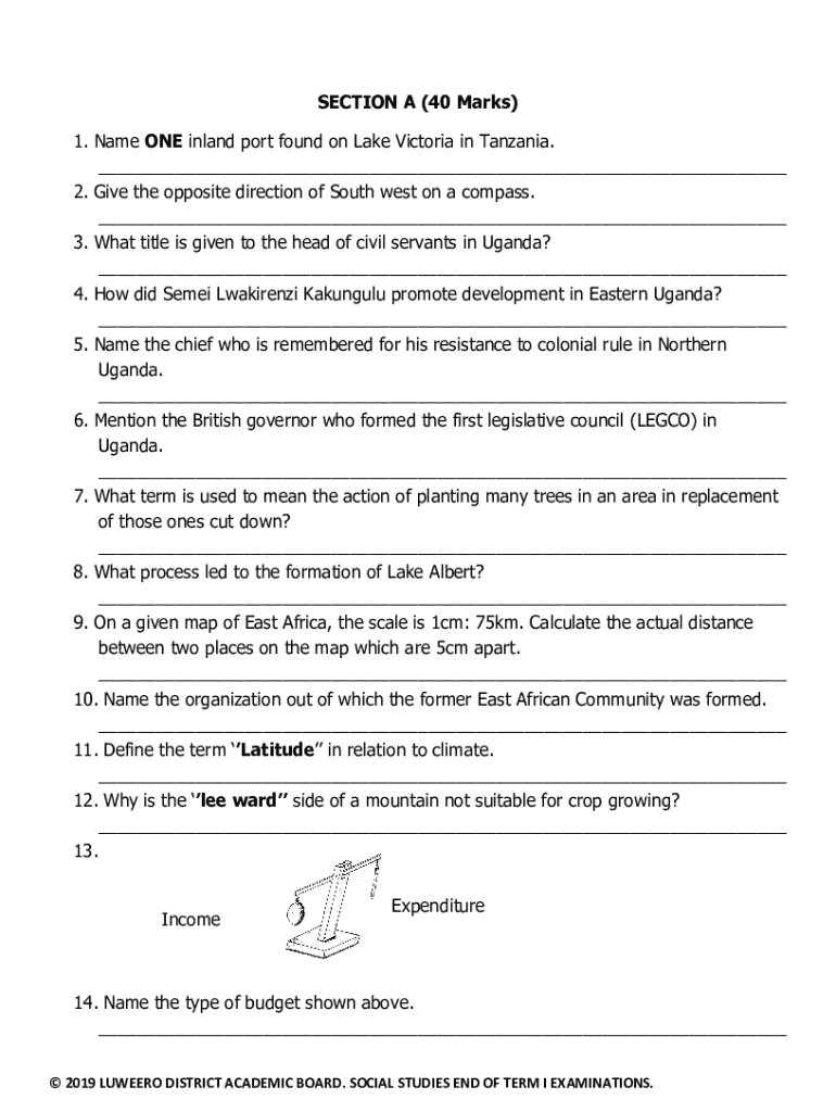 SECTION A (40 Marks) 1. Name ONE inland port found on Lake Victoria in Tanzania. ___ 2. Give the opposite direction of South west on a compass. ___ 3. What title is given to the head of civil servants