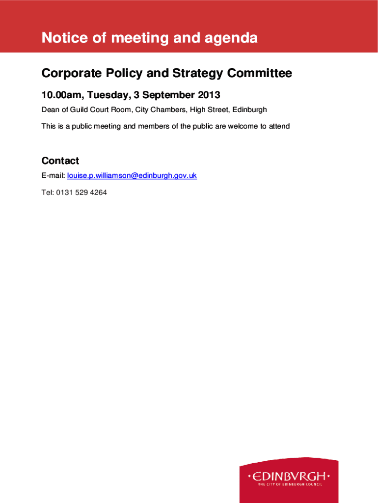 This document outlines the agenda and details for the Corporate Policy and Strategy Committee meeting scheduled for 10:00 am on Tuesday, 3 September 2013, at the Dean of Guild Court Room, City Chambers,